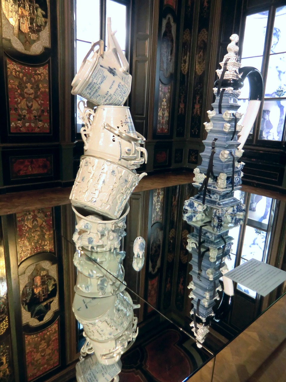 Dat doet het Gemeentemuseum in ieder geval wél, want je verwacht geen eregalerij van Delfts Blauw. Je verwacht ook geen buitenproportioneel poppenhuis dat subtiel is ingericht met Delfts Blauwe vazen, waarvoor je die romantische traptreden daadwerkelijk betreedt en op de tipjes van je tenen naar binnen gluurt. Je verwacht in een porseleinen opstelling geen hertenbehang of blinkende vaasverzamelingen in donkere ruimtes. Deze speelsheid wordt echter bij elkaar gehouden door het sfeervolle en luxe decor van een 17e-eeuws interieur. Dit is Delfts Blauw in een 21e-eeuws museum, waar een dergelijk creatieve cross-over heel goed past.